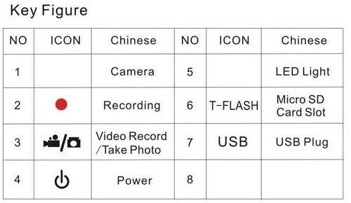 * one key long-distance audio recording function,the format is WAV.(Effective range 8M) * camera function,the format is JPG * high-definition video recording,the format is AVI * TV-OUT function,NTSC/PAL available * PC camera function * computer time synchronization * hot-swap 128M - 16gb high-speed micro SD card * USB 2.0 data transfer * Battery: Polymer lithium battery 3.7v 180 - 215mAh * Working environment: -5 - 40 degree
